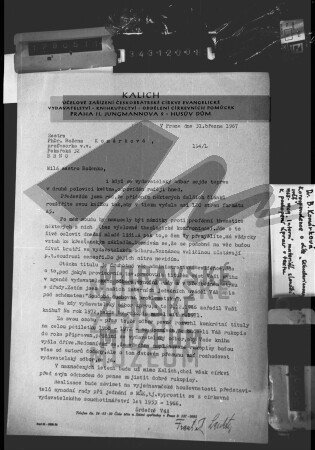 Dopis z vydavatelství Českobratrské církve evangelické Kalich adresovaný Boženě Komárkové, korespondence o jejím díle Sekularizovaný svět a evangelium, březen 1967.