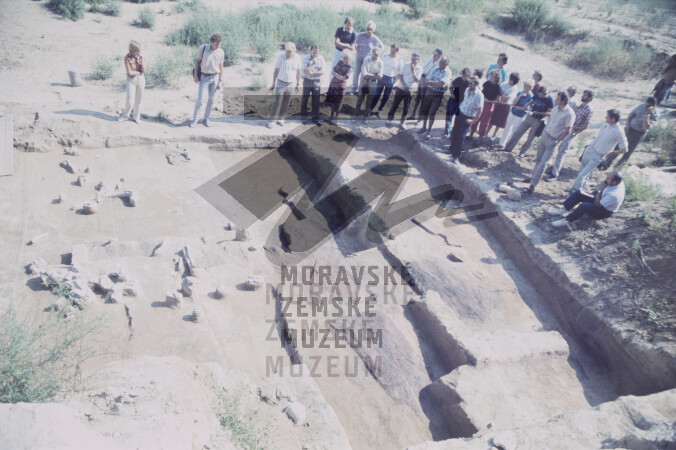 Komise na výzkumu. Prohlídka gravettienské kulturní vrstvy. M. Oliva třetí zleva.