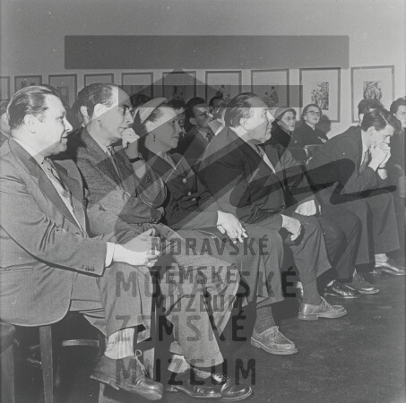Večer poezie Vítězslava Nezvala v Domě umění, vedle Nezvala sedí jeho sestra Vlasta Fischerová a její manžel, rok 1954