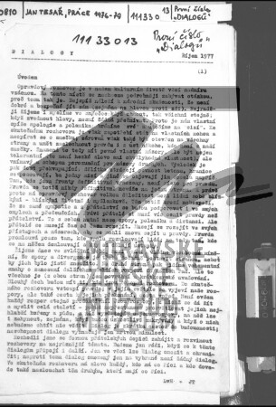 První číslo Dialogů, samizdatového časopisu, na němž se kromě Jana Tesaře podíleli také Ladislav Hejdánek a Rudolf Battěk, říjen 1977